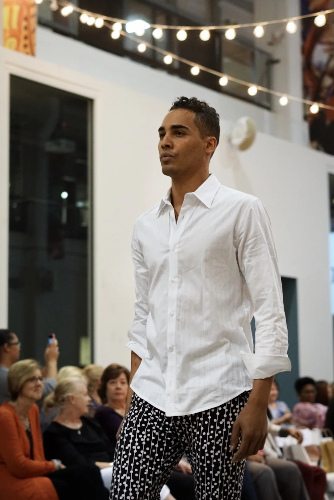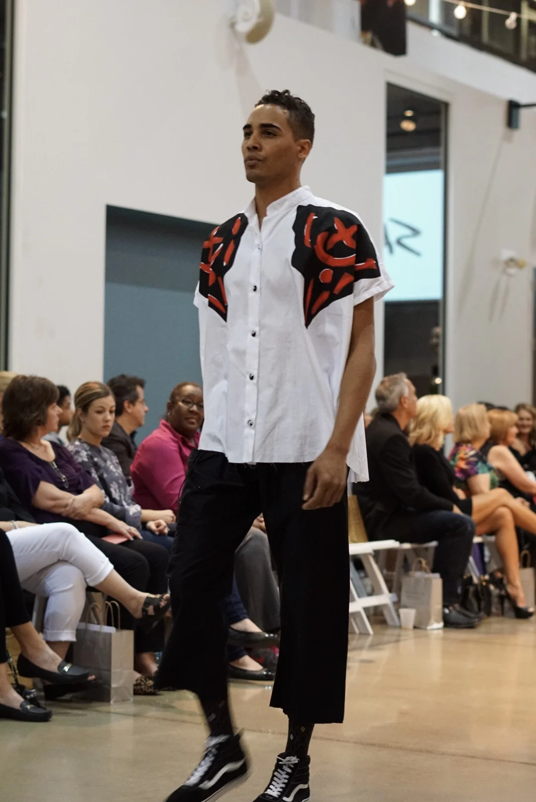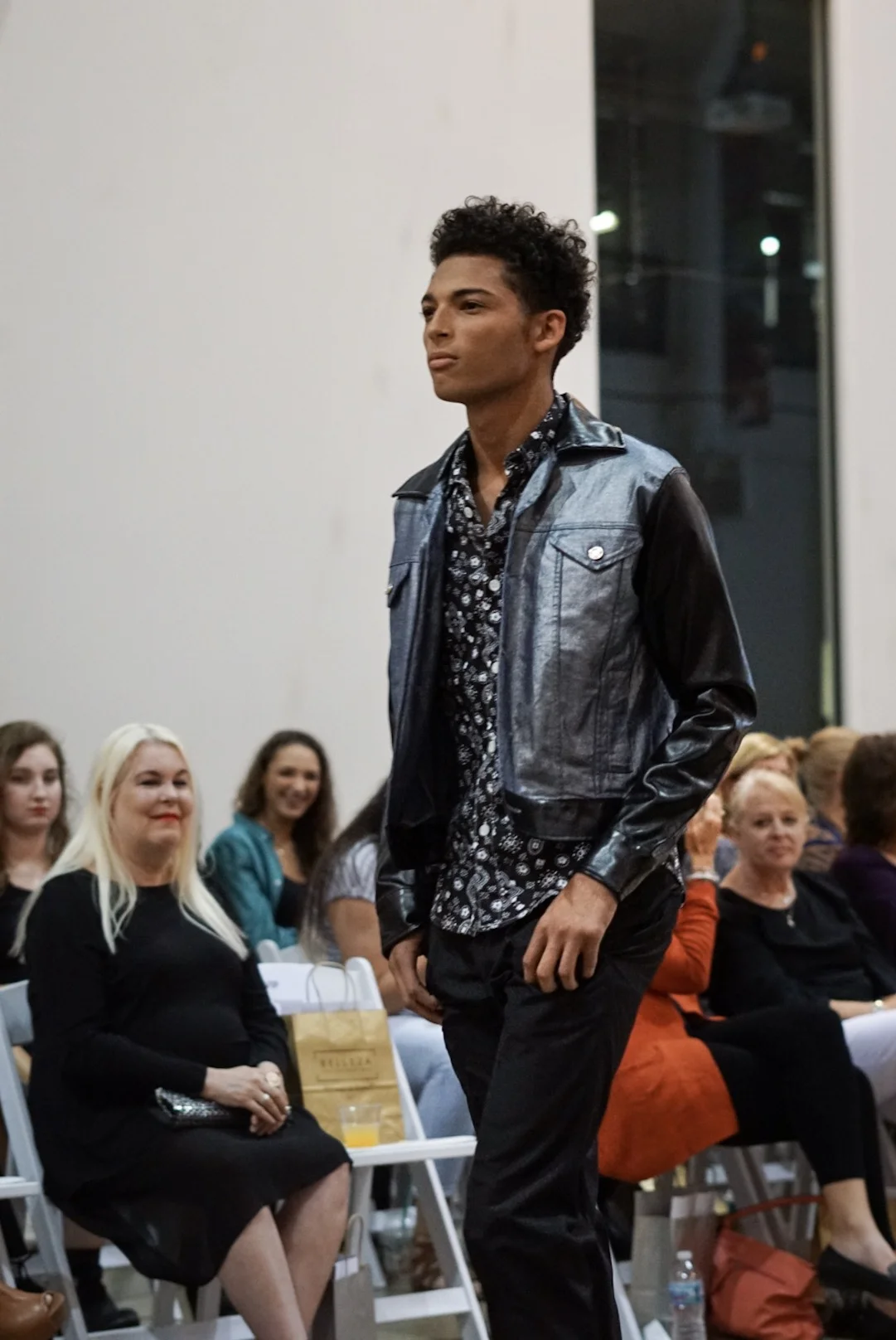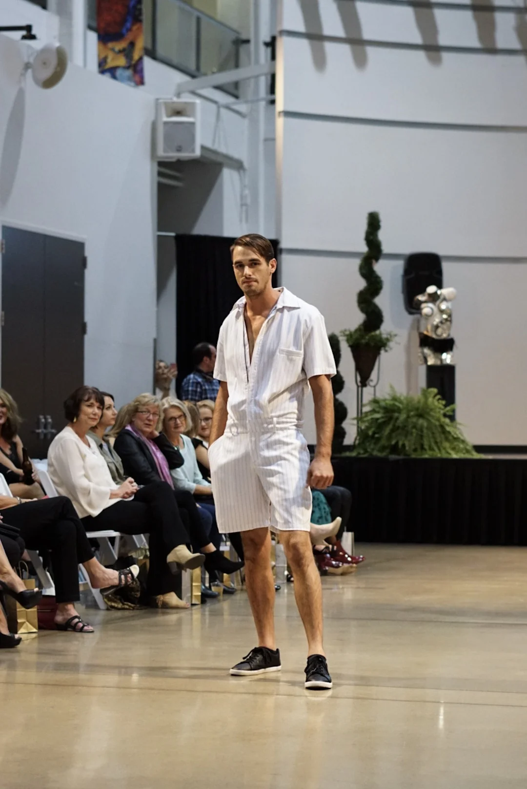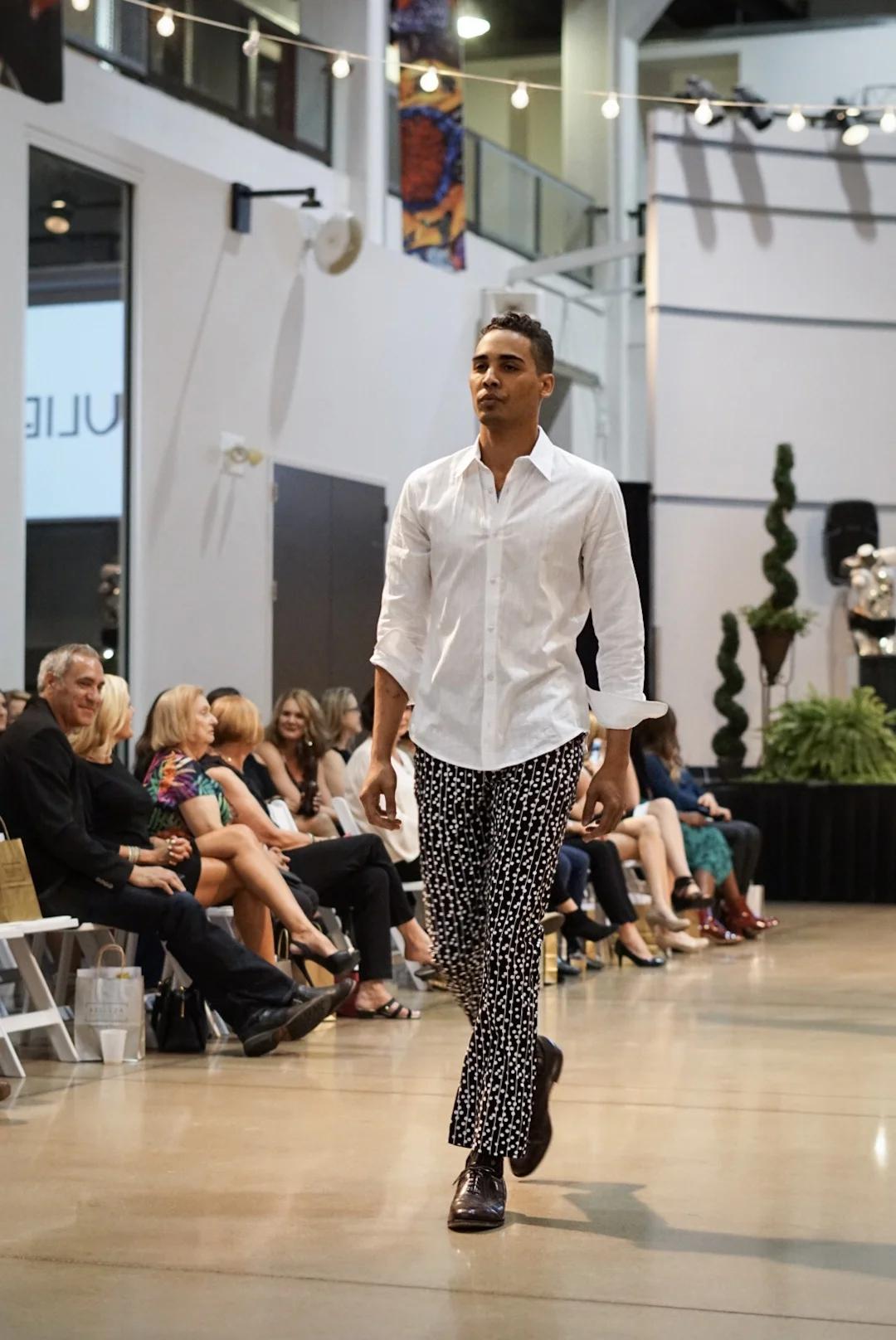Also noteworthy was a fabulous collection by local designer, Paulie Gibson, that proved menswear design is alive and thriving in St. Louis. Bold patterns and sharp as tack tailoring stood front and center, supported by a muted color palette of white, black, and gray. The styling was somewhat reminiscent of the 1970s with groovy flared trousers, everyday pinstripe, and a jean jacket to envy all.