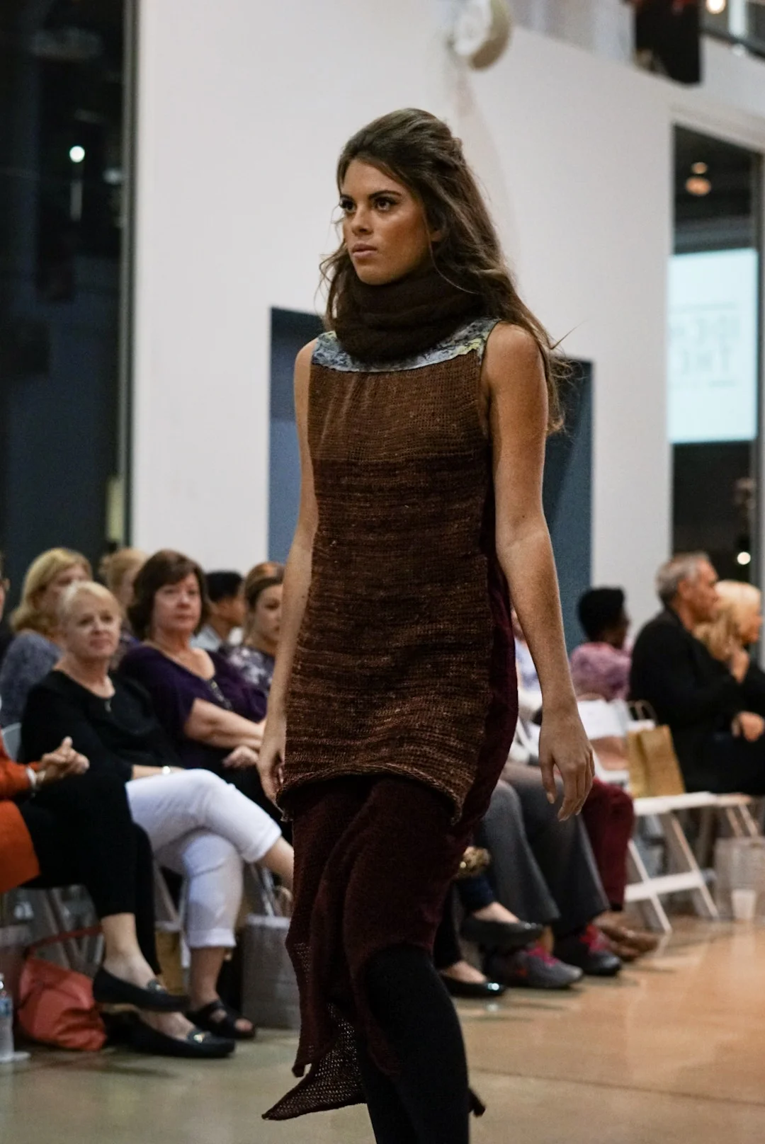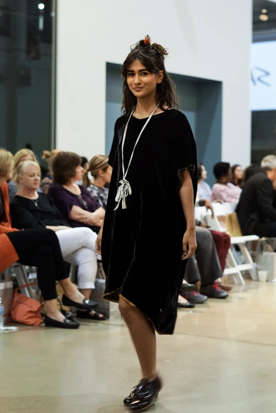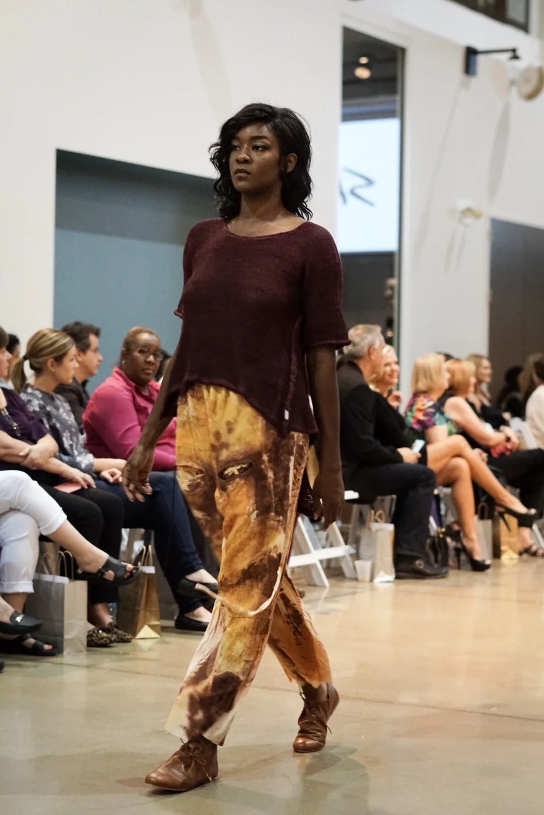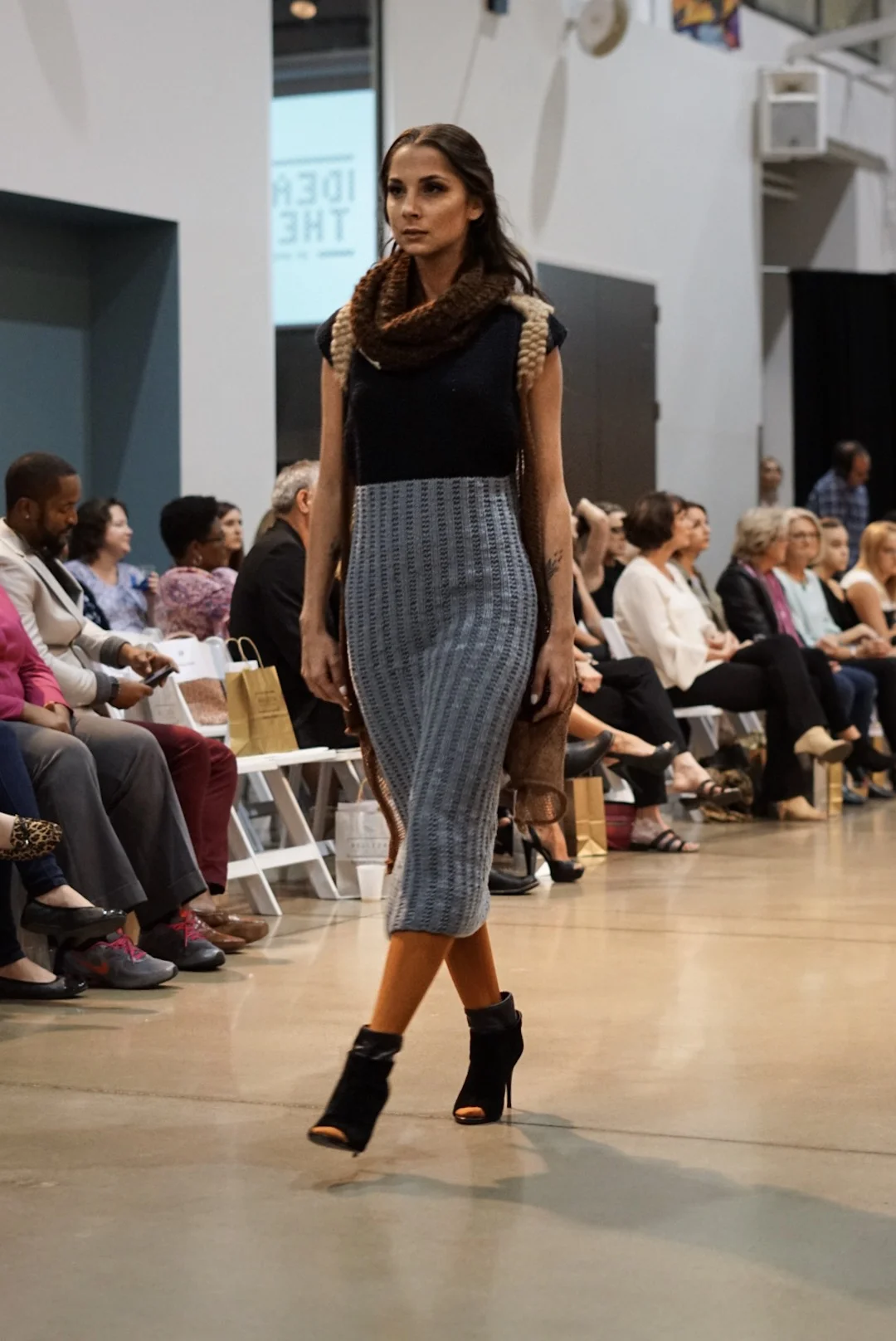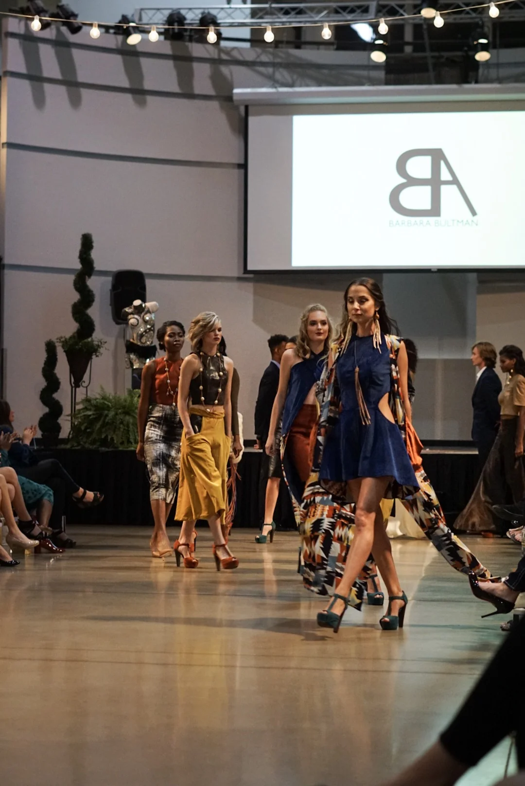 The evening started with one of my favorite local designers, Barbara Bultman. Designing leather jewelry and sophisticated womenswear with a rustic twist, there's not much this woman can't do. Beautiful hues of navy blue, mustard yellow, and ambered orange paired nicely with earthy tribal prints and textured leather.